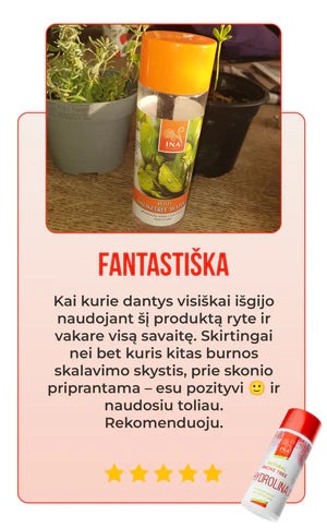 Dūmų medžio Hydrolina (150ml) yra ne tik gražus butelis; tai dantimis paremta. Klinikinių tyrimų sėkmės rodiklis viršija 90 %, todėl jis parodo savo galią mažinti kraujavimą iš dantenų, blogą burnos kvapą ir pagerinti bendrą burnos sveikatą. Spustelėkite, kad gautumėte išsamią sertifikato informaciją.