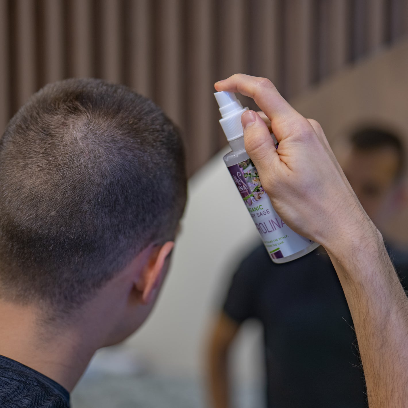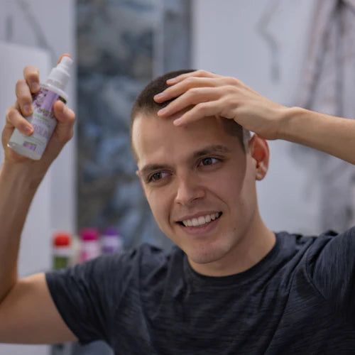 Purškite priemonę į plaukų šaknis. Švelniai, masažuojant pirštų galiukais, įtrinkite priemonę į galvos odą.