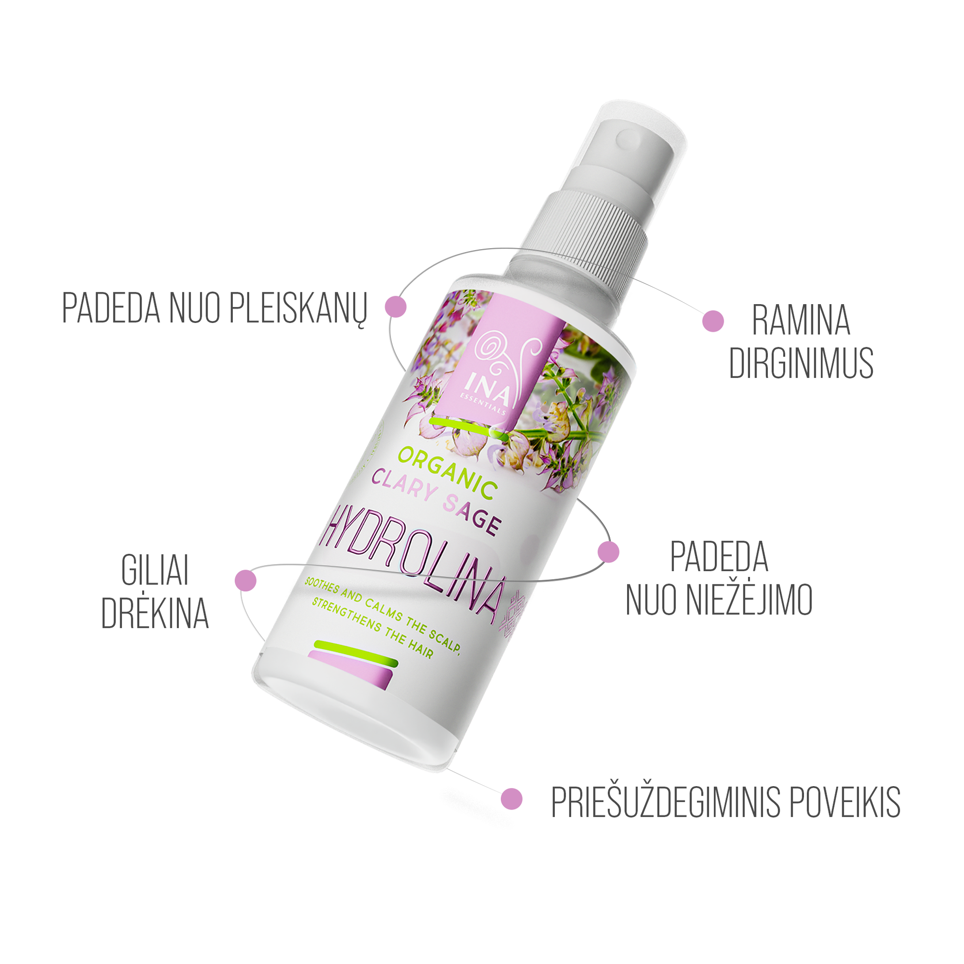 Ekologiška Šalavijų Hydrolina giliai valo galvos odą ir kontroliuoja riebalų gamybą. Pastebimai sumažėja paraudimai, dirginimai, niežulys ir pleiskanojimas.