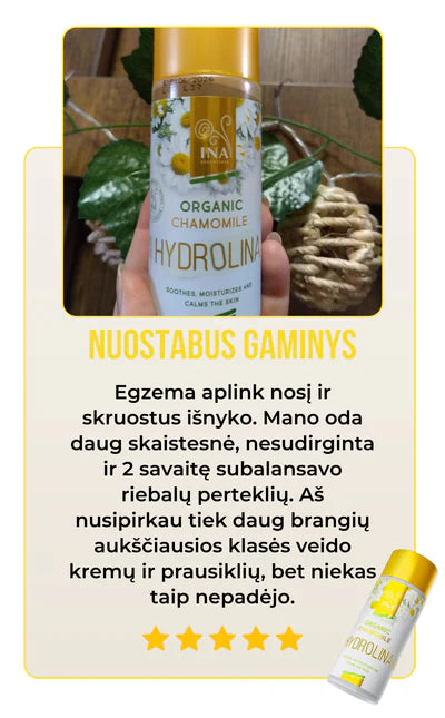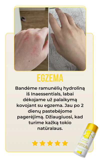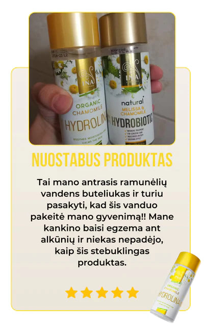 Ekologiška ramunėlių Hydrolina (150ml) yra daugiau nei tiesiog nuostabus buteliukas, jį papildo tikri klientų atsiliepimai. Įspūdingas klientų pasitenkinimo balas, viršijantis 90%, mūsų produktas rodo savo veiksmingumą gydant egzemą, bėrimus ir odos sudirgimus, kartu gerinant jūsų odos sveikatą. Netikėkite mūsų žodžio, skaitykite mūsų klientų istorijas.