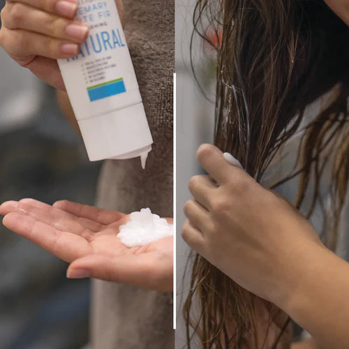 - 2 veiksmas: tada pamaitinkite plaukus mūsų natūraliu plaukų kondicionieriumi su rozmarinu ir balta egle. Jis puoselėja ir stiprina plaukus, sumažina trintį, padidina blizgesį ir skatina sveiką plaukų augimą.