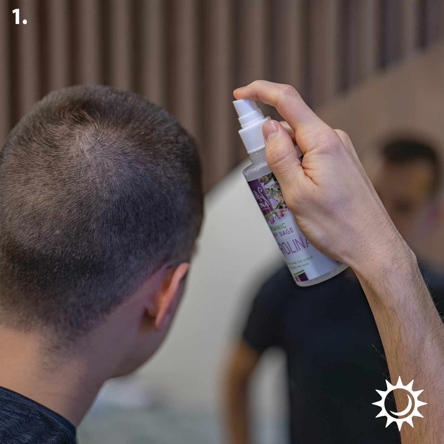 - 1 veiksmas: pradėkite savo dieną naudodami 100% ekologišką šalavijų vandenį - Hydrolina. Jo antibakterinės savybės valo galvos odą, mažina pleiskanų atsiradimą ir ramina galvos odos dirginimą. Ekologiška šalavijų hydrolina sukuria apsauginį skydą nuo kasdienių teršalų ir kondicionuoja jūsų plaukus, suteikdamas puikią aplinką jūsų galvos odai kvėpuoti ir klestėti.