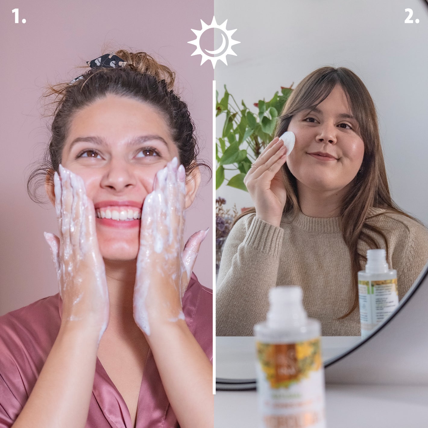 - 1 veiksmas: vakare pakartokite valymą su mūsų ramunėlių žolelių muilu, kad nuplautumėte dienos teršalus.