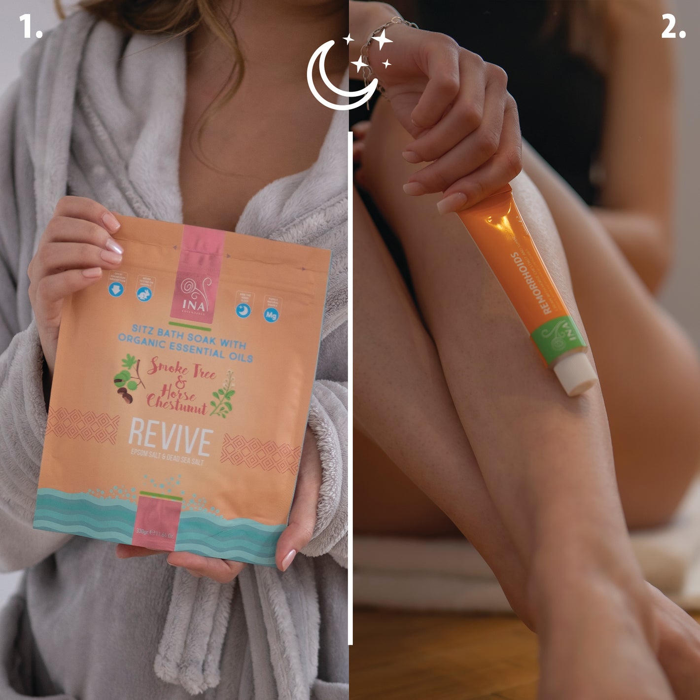 - 1 veiksmas: 1–3 kartus per savaitę pasilepinkite atpalaiduojančia vonia, naudodami mūsų „Revive Sitz“ vonios druskas su dūmų medžiu ir arklio kaštonu. Šios druskos, praturtintos kaštonų ekstraktu ir dūmų medžio aliejumi, mažina sunkumo ir nuovargio jausmą kojose, mažina stresą ir skatina odos regeneraciją. Druskose esantis magnis padeda pagreitinti odos regeneraciją, skatina greitesnį bet kokių pažeistų vietų palengvėjimą.
